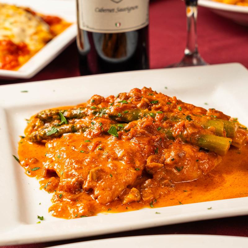 1/2 Tray $65.00 / Full Tray $120.00 • Roasted peppers, spinach & grilled chicken in a pink sauce.
